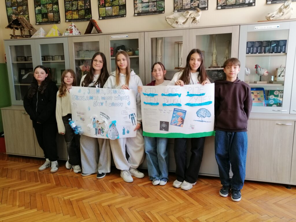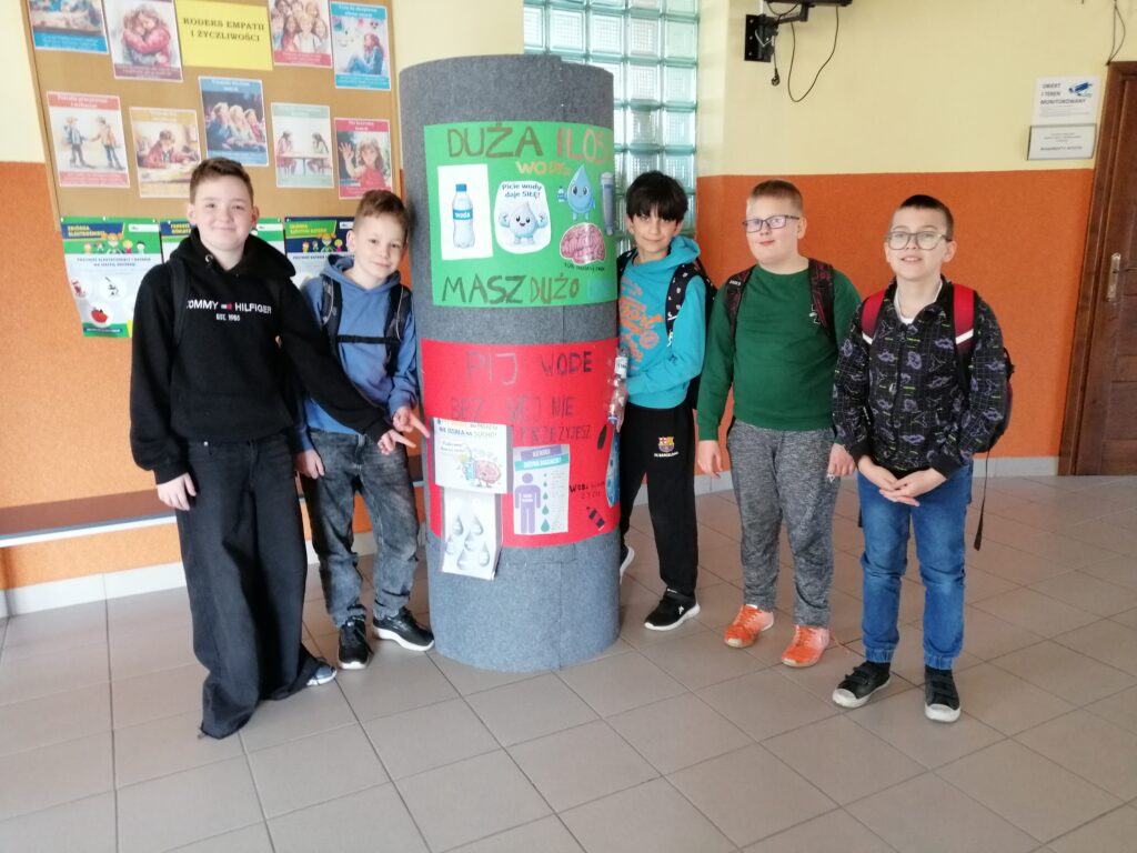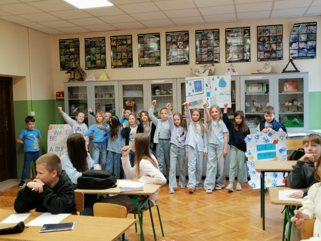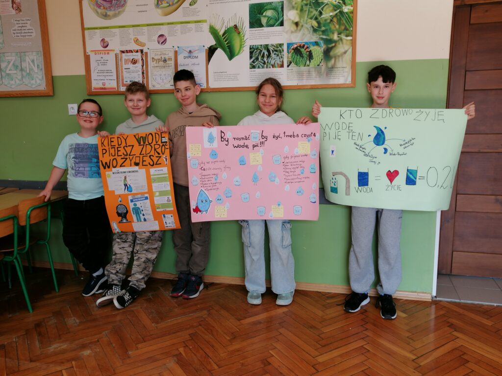 Klasy czwarteuczestniczyły w prelekcji szkolnej pielęgniarki dotyczącej roli wody w organizmie. Uczniowie obejrzeli filmy edukacyjne oraz przygotowali plakat umieszczony na drzwiach sali. Podczas wycieczki do kina promowano zdrowe nawyki, w tym zabieranie w podróż wody mineralnej.