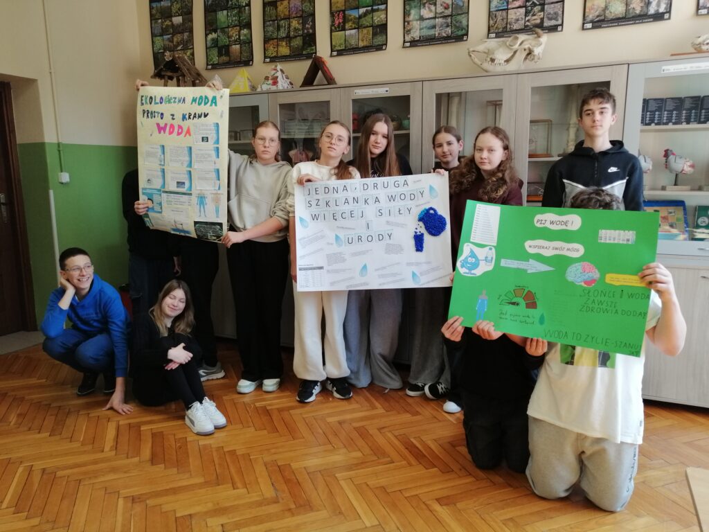 Uczniowie klasy 6b wykonali plakat dotyczący roli wody w organizmie człowieka oraz dyskutowali o wodzie jako motywie literackim. W klasie 7b w ramach zajęć z języka polskiegopowstała piękna gazetka tematyczna ukazująca motyw wody w literaturze oraz powiedzenia z nią związane.