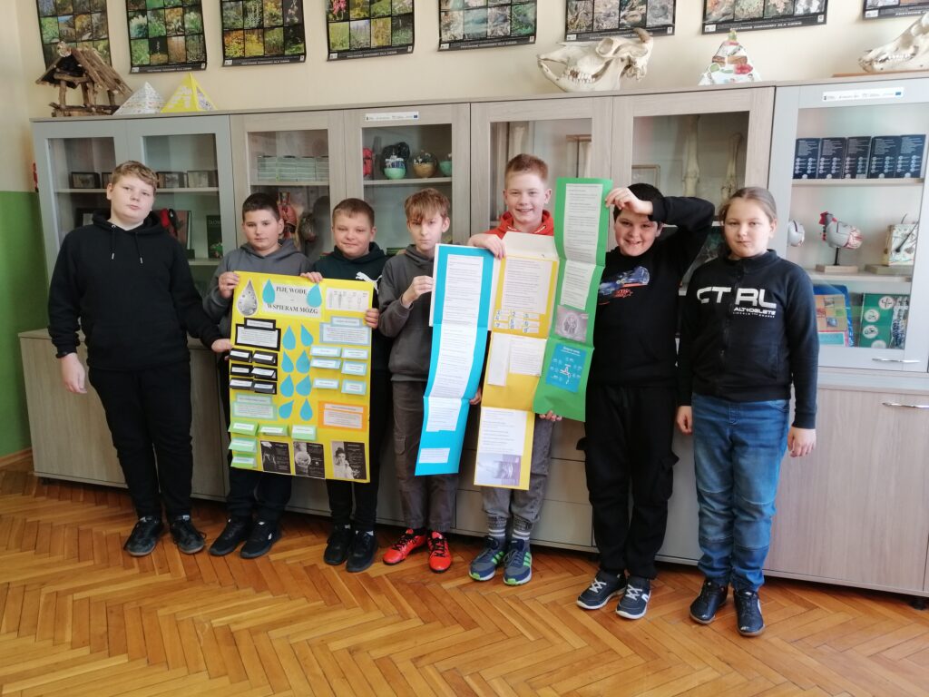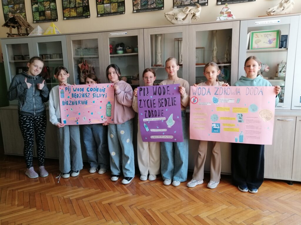 W ramach lekcji przyrody i biologii – 4b, 5aoraz wszystkie klasy6–8realizowały projekt „Pij wodę – wspieraj mózg”. Uczniowie przygotowali w zespołach plakaty przedstawiające korzyści wynikające z prawidłowego nawodnienia organizmu oraz negatywne skutki odwodnienia, łącząc wiedzę biologiczną z elementami edukacji prozdrowotnej.