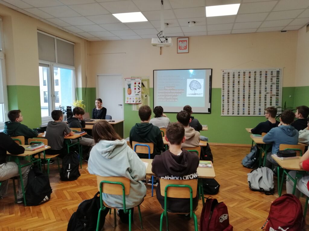 Uczniowie klas pierwszych uczestniczyli również w zajęciach profilaktycznych z pedagogiem na temat odporności fizycznej i psychicznej. Podczas spotkania omówiono zasady dbania o zdrowie oraz sposoby radzenia sobie z trudnościami.