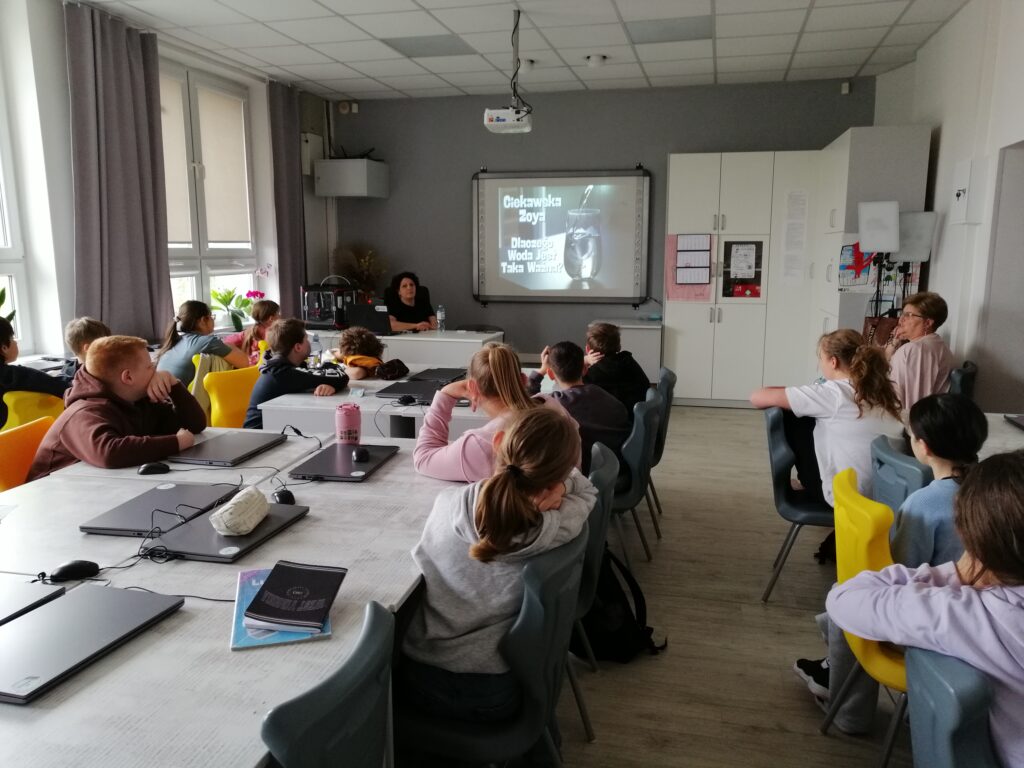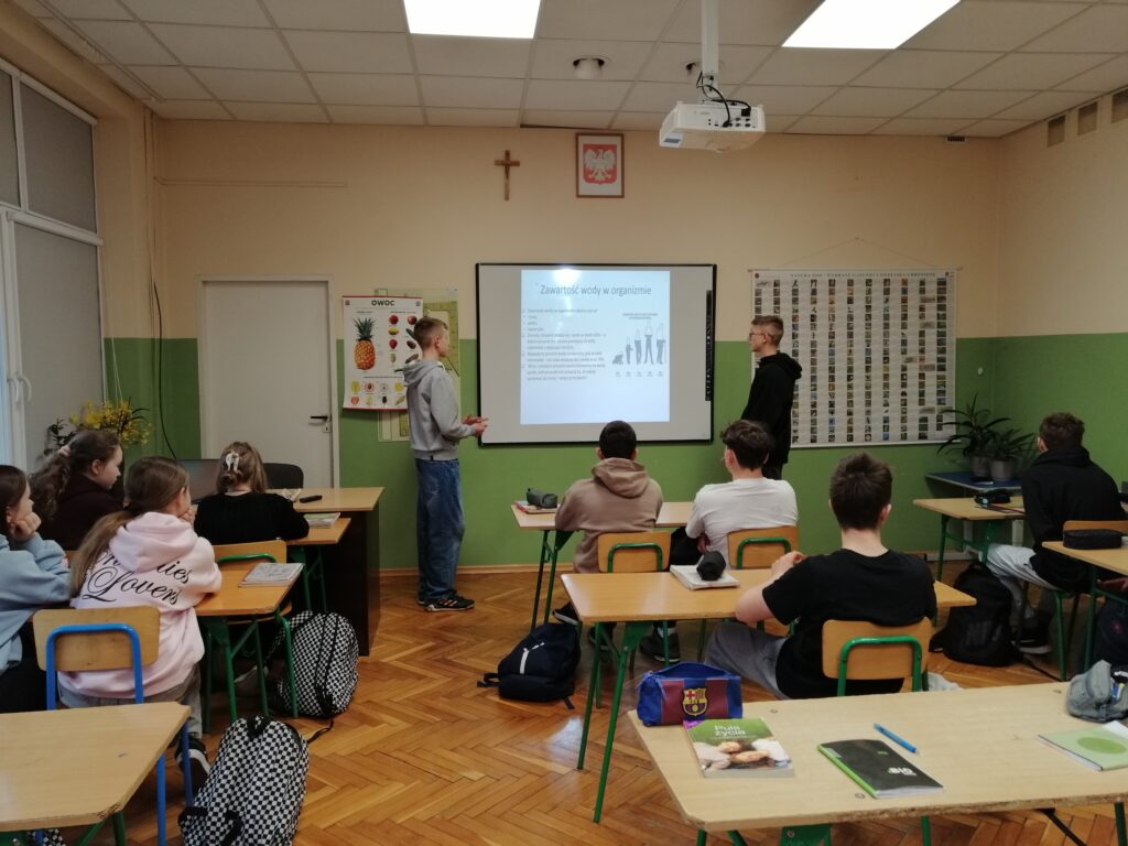 W ramach lekcji biologii uczniowie klas 7–8 przygotowali i przedstawili na forum klas prezentacje multimedialne na temat roli wody w prawidłowym funkcjonowaniu mózgu oraz korzyści wynikających z dobrego nawodnienia organizmu.