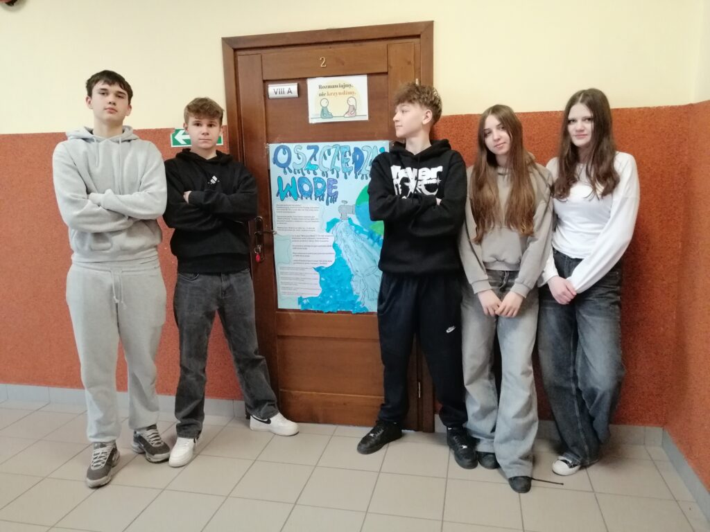 Uczniowie klasy 8a na lekcjach języka polskiego przygotowali teksty perswazyjne pt. „Dlaczego warto pić wodę?” oraz hasła reklamowe promujące zdrowy styl życia. Wykonali również plakat na temat oszczędzania wody, jako cennego zasobu przyrody.